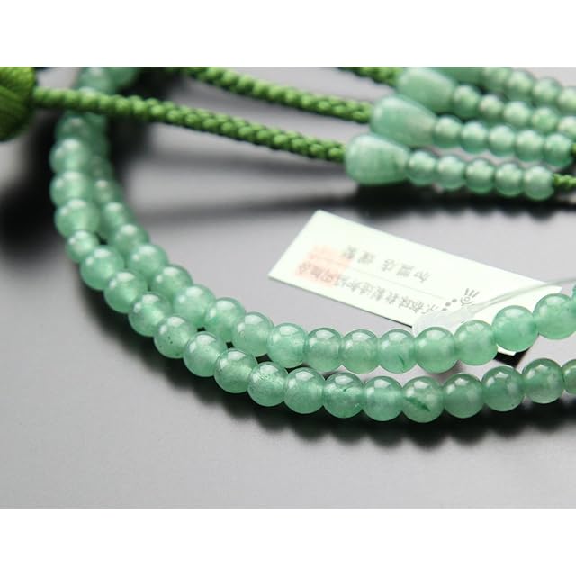 真言宗、女性用の正式なお数珠でございます。素材は印度翡翠でございます。昔からなじみ深い素材で、喪服によく合う、柔らかく優しい色合いでございます。房は、丈夫で扱い易く、型崩れを起こさない小田巻梵天房を採用させて頂いております。房色は印度翡翠の柔らかい色合いを少し引き締める柳色を採用させて頂きました。この他にも、真言宗・女性用のお数珠、多数ご準備ございます。