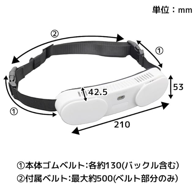 【サイズ】本体:幅210×奥行42.5×高さ53(mm) 本体ゴムベルト長さ:それぞれ約130mm(バックル含む) 付属ベルト長さ:最大約500mm(ベルト部分のみ)